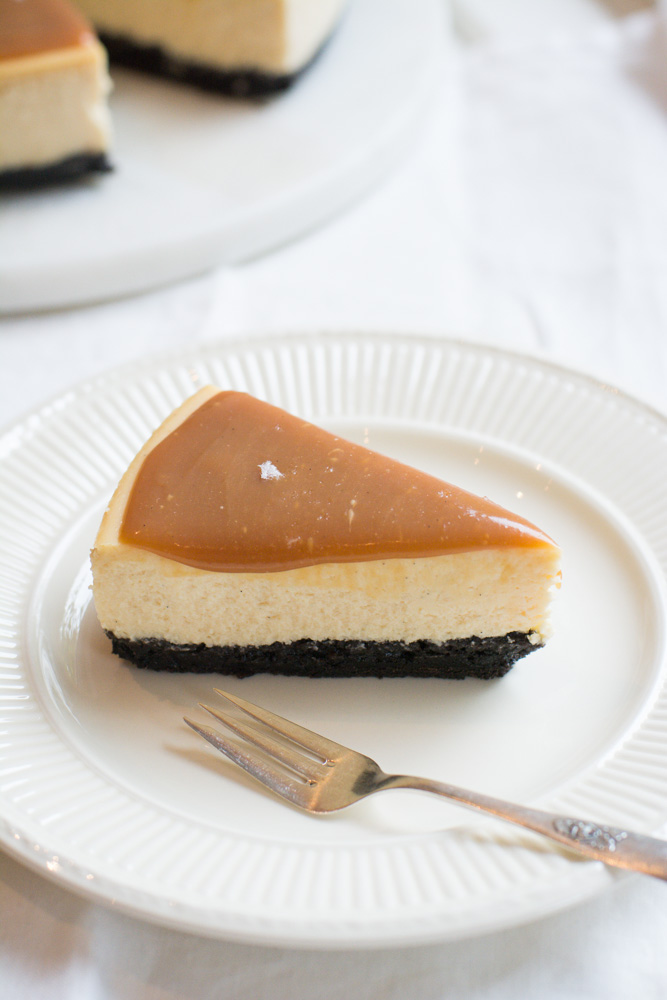 Inden servering fordeles noget af karamelsaucen over cheesecaken. Fordel det ud med en vinklet palet eller bagsiden af en spiseske. Drys med havsalt og server.