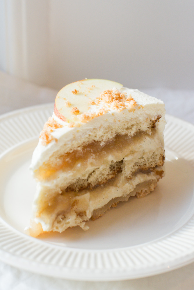 Pynt toppen med friske æbleskiver og knuste makroner.
