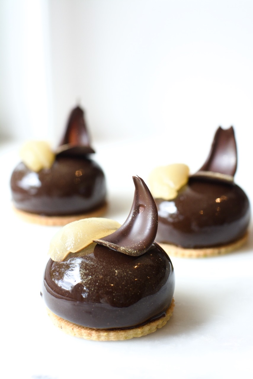 Sæt én af dine chokoladeblade på hver kage. Drys guldstøv over kagen og afslut med at lægge pæreskiver ved siden af chokoladebladet.