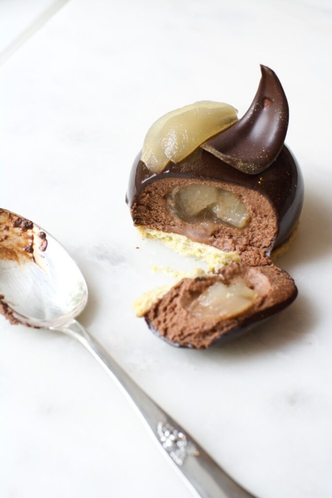 Fordel chokolademoussen i 6 silikoneforme (f.eks. Stone fra Silikomart). Tryk de frosne pærestykker ned i midten, dæk dem med chokolademousse, gør moussen plan med formens kanter og sæt formen på frys natten over.